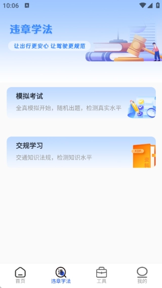 3、在违章学法页面中可以了解模拟考试和交规学习两大不同的版块内容;
