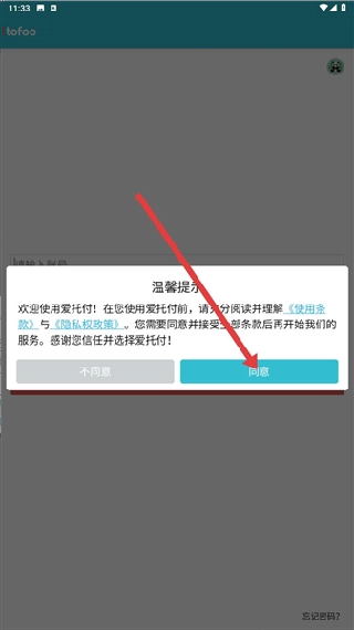 1. 打开爱托付老师手机版,进入登录界面,启动协议确认流程,弹出温馨提示弹窗,点击弹窗右边的同意按钮完成协议确认,这是使用软件前的必要步骤。