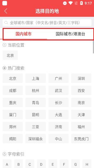 2、在确定上述分类后,接下来需要选择出发地与抵达低,我们可通过国内以及国际城市的分类寻找,且还可以通过上方检索全球的城市,支持中文名、英文名称、三字码等