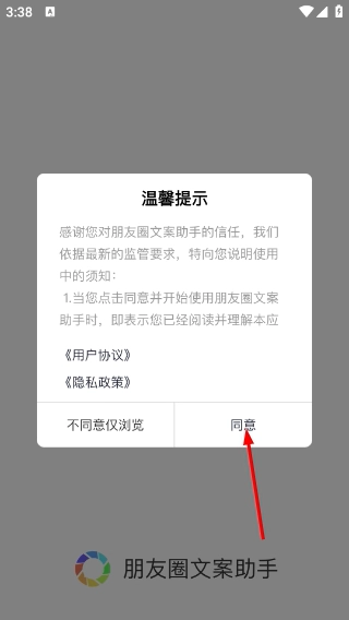 在使用【朋友圈文案助手】之前,需要先阅读温馨提示中的【用户协议】与【隐私政策】,并点击【同意】按钮,这是进入该软件的必要前置步骤。