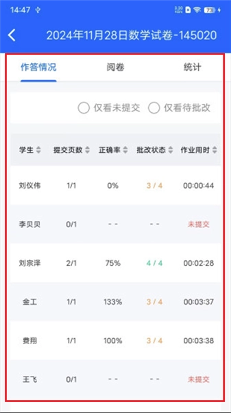 6、此外,借助该软件还能够查询到某一时间段内的作业完成情况以及批改情况。