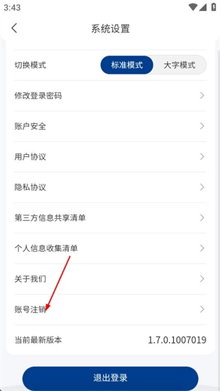 在系统设置页面中,点击账号注销选项,即可进入账号注销说明页面。