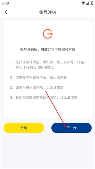 4、进入账号注销说明页面后,点击“下一步”按钮,即可跳转至安全验证页面。