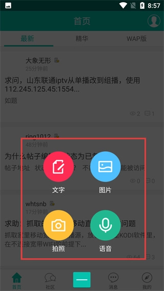 1、打开应用进入首页后,点击底部的【+】按钮,会弹出包含【文字】、【图片】、【拍照】、【语音】选项的发帖菜单。