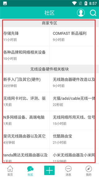 3、点击底部的【社区】选项进入社区页面后,能看到【商家专区】、【无线设备硬件相关板块】等不同分类的板块。