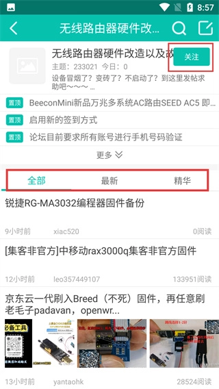 4、进入【无线路由器硬件改造及故障】板块,点击【关注】按钮,也可切换【全部】、【最新】等标签查看内容。