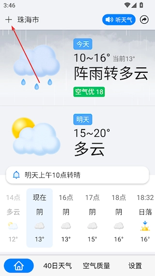 1、打开准点天气后,地左上角的加号
