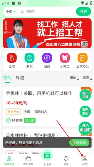 进入招工帮应用后,点击底部导航栏中的“我的”选项,即可进入个人中心页面。