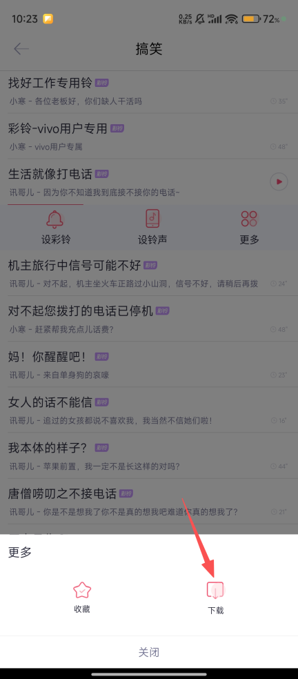 4、在弹出的选项里,点击【】,就能将喜欢的铃声下载到手机,轻松完成设置啦。