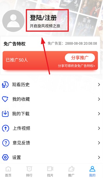 1、下载安装并打开旋风视频,进入首页后点击我的