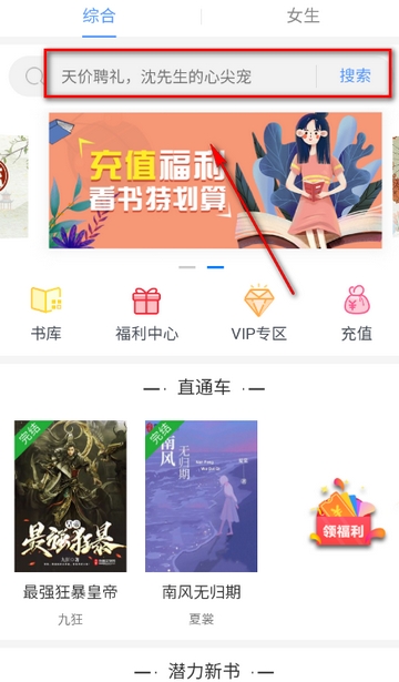2、用户根据不同的页面,找到并点击搜索按钮后,输入小说的名称