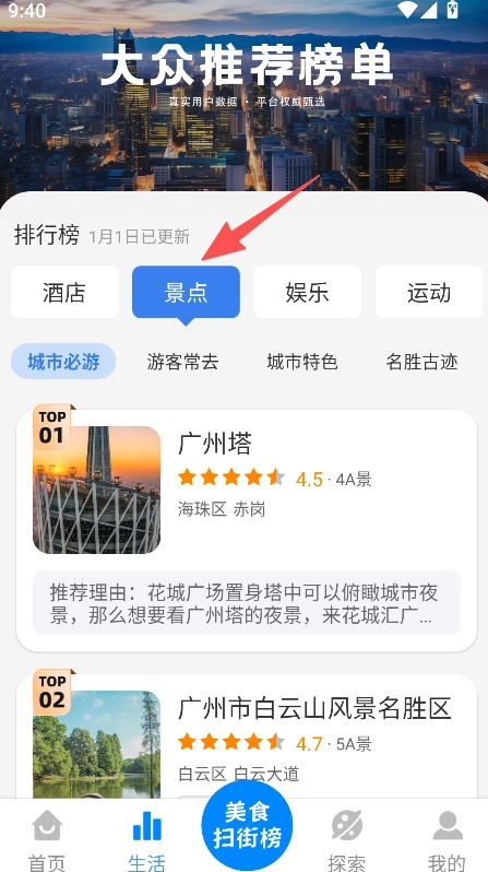 2、切换城市必住、城市必游等细分分类,查看对应类别的推荐内容。