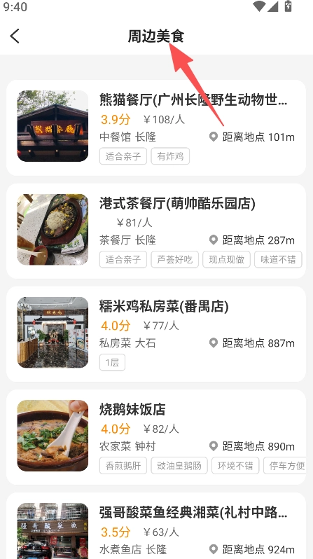 3、呈现周边美食的评分、人均消费、距离等信息,并提供相应的消费配套资讯。