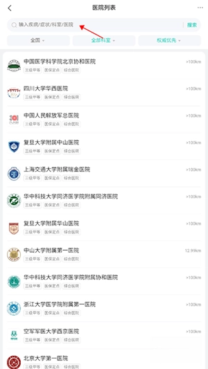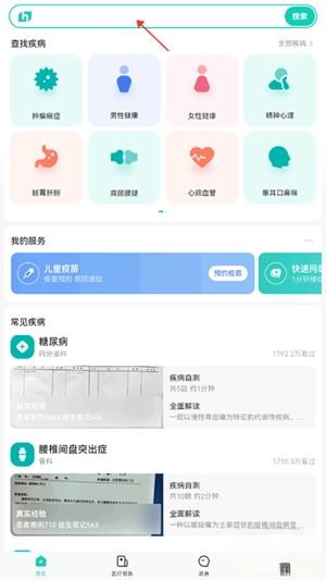 1、在应用首页的搜索框中,输入你想要就诊的医院名称来进行搜索。