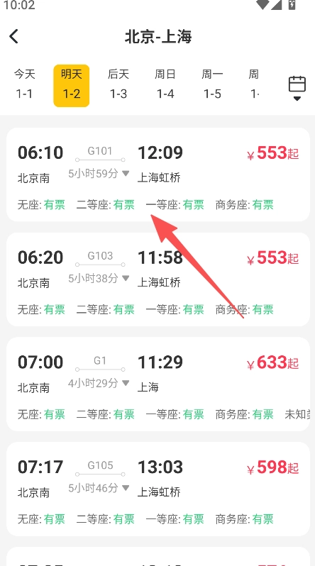 2、呈现车次的时间、时长、票价及余票信息,信息维度完备,契合车票查询的核心需求。