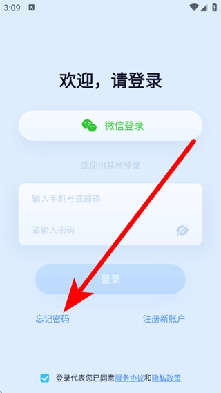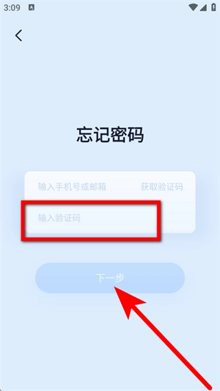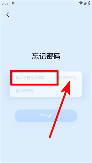 2、进入忘记密码页面后,填写手机号或邮箱,接着点击获取验证码按钮。