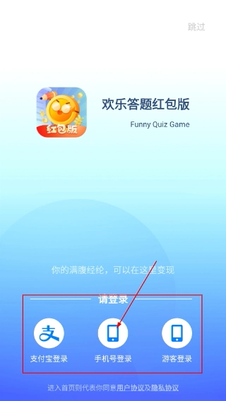 1、打开【欢乐答题红包版】界面,可选择【支付宝登录】【手机号登录】【游客登录】,若点击【手机号登录】选项。