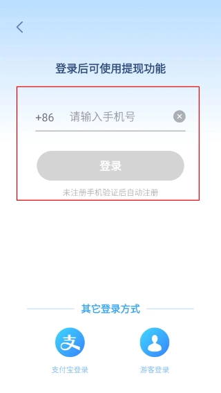 2、进入显示【登录后可使用提现功能】提示的页面,需填写【+86-请输入手机号】,然后点击【登录】;未注册的用户通过手机验证后会自动完成注册。