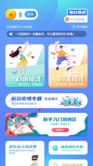 4、进入首页后能看到【提现】按钮,可选择【自由模式】或【闯关模式】进行答题,新手还能进入【新手入门热身区】熟悉操作,通过答题可以赚取现金并进行提现。