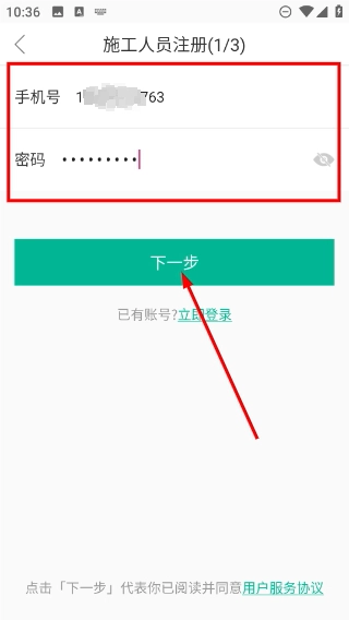 4、在【施工人员注册(1/3)】页面填写【手机号】、设置【密码】,点击【下一步】完成注册,点【立即登录】可返回登录页。