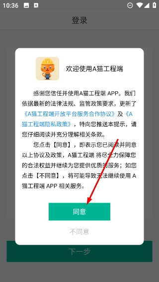 1、进入【A猫工程端】后,请先仔细阅读【A猫工程开放平台服务合作协议】与【A猫工程端隐私政策】,点击【同意】按钮后,方可继续使用相关功能。