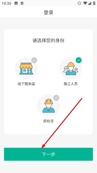 2、在【请选择您的身份】界面勾选对应的角色选项,比如【线下服务店】【施工人员】这类身份,勾选完成后点击【下一步】按钮,即可进入登录页面。