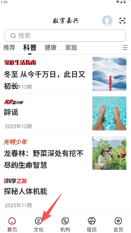 1、在应用首页点击底部导航栏的“文化”按钮进入。