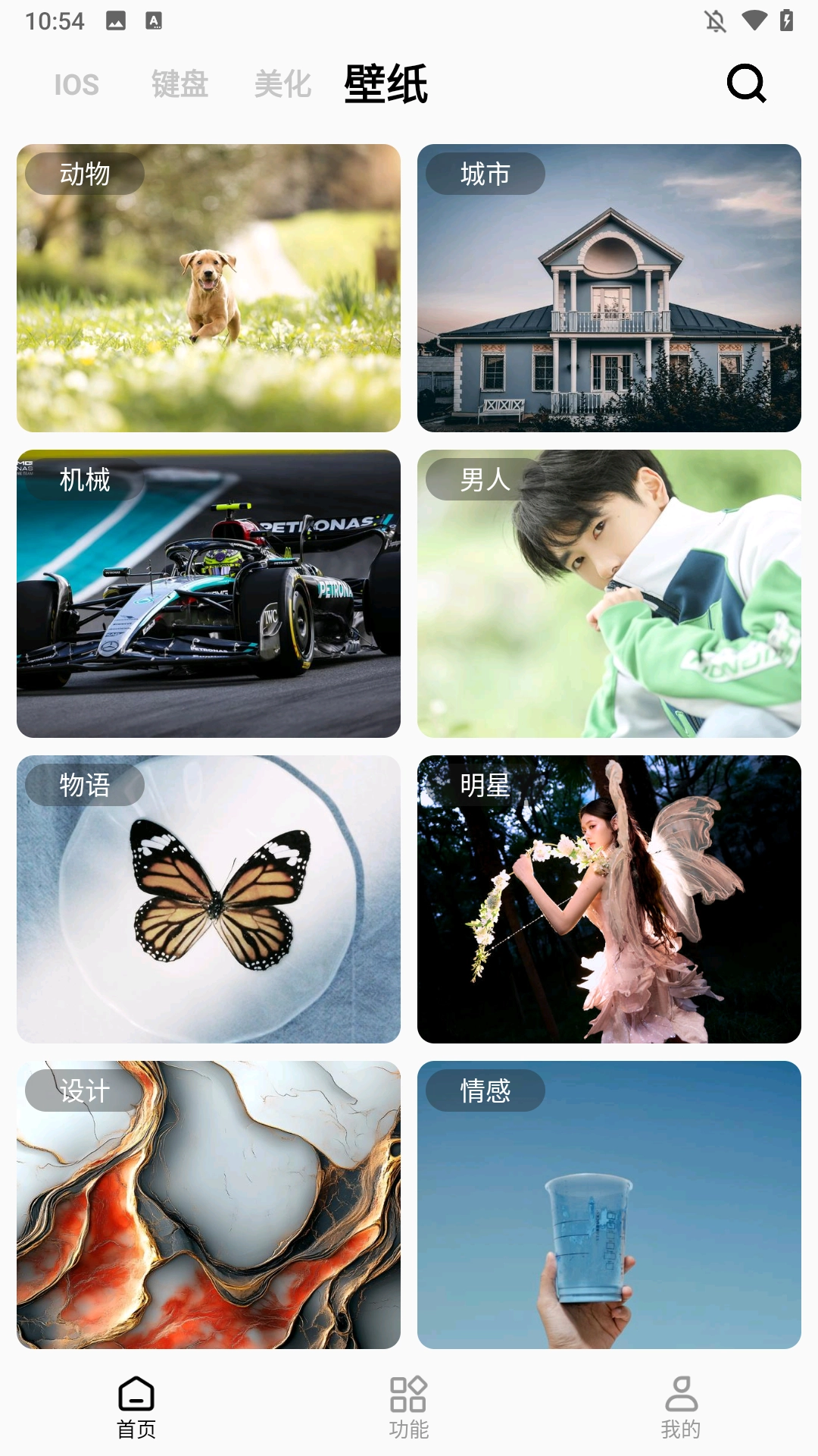 2、“壁纸”专区提供分类标签查找与搜索功能,帮助用户快速找到心仪的高清壁纸,查看详情后可一键设置为背景。