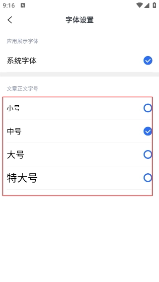 4、在【字体设置】页面,你可以选择【小号】【中号】等不同的字号选项,选中相应选项后,就能调整应用内文字的显示大小了。