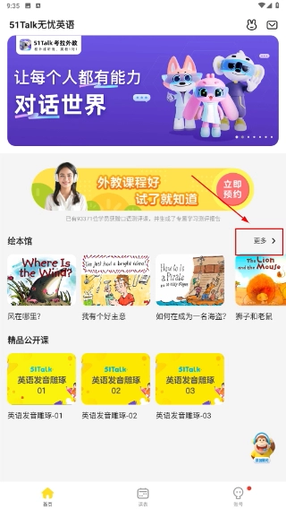 1、在主界面绘本馆板块的旁边,点击【更多】按钮,进入绘本馆分类页面,这样就能查看完整的资源了。