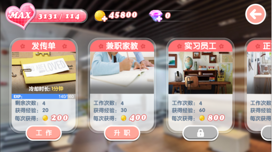 追求心仪的女生真的有那么困难吗?要是感觉身心俱疲,就得赶紧补充体力,不然心仪的女生可能就被别人抢先一步了!补充体力值是需要花钱的哦!工作是用来做什么的呢?当然是为了挣钱去追求心仪的女生呀。