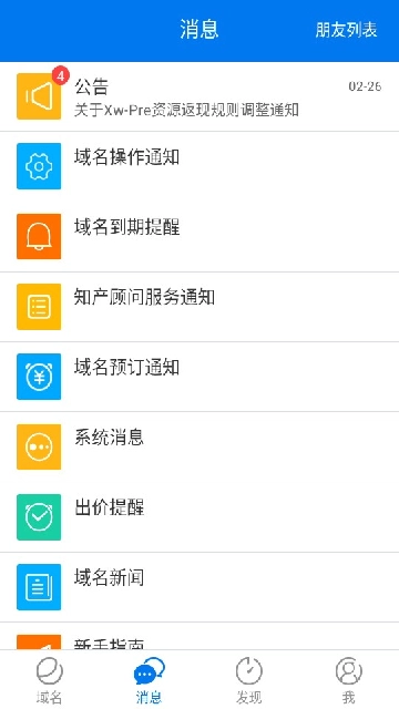 3、进入“发现”板块参与平台活动,通过每日登录抽奖、合卡赢取旅行礼品,还能领取优惠券用于域名注册或交易;“消息”板块会实时推送到期提醒、解析变更、交易通知等关键信息。