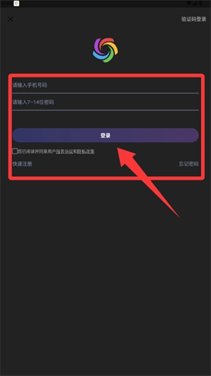 1、登录界面输入手机号与密码,勾选协议后点击登录进入应用。