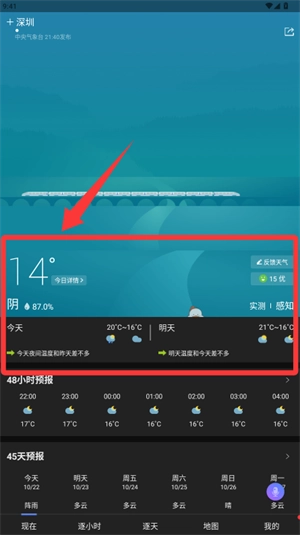 3.选好城市就可以查到当前城市的天气了,风速、体感、能见度、云量都可以很清晰的看到;