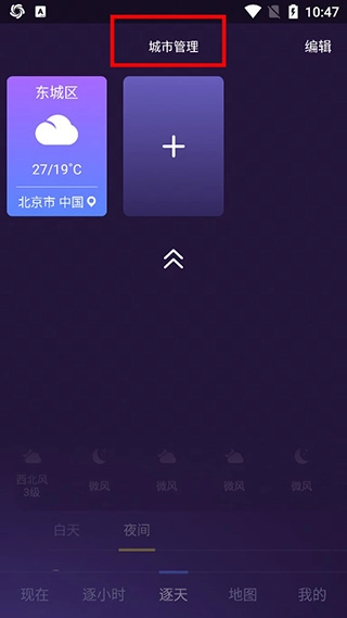 2、在城市管理界面中,点击“+”图标或“添加城市”按钮