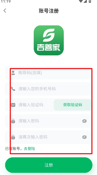 1、打开吉善家软件后,点击注册入口,进入账号注册页面,开始创建新账号。