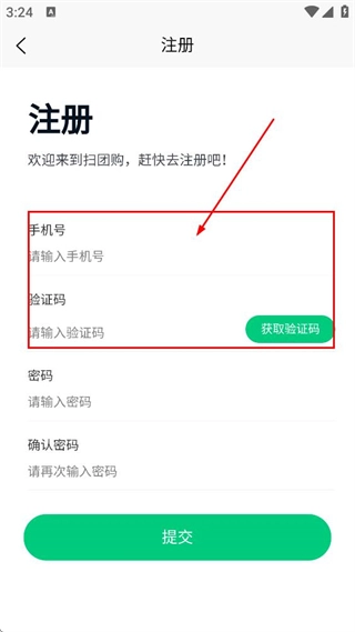4、进入注册页面后,先填写手机号,待获取验证码后,再填入对应的验证码。