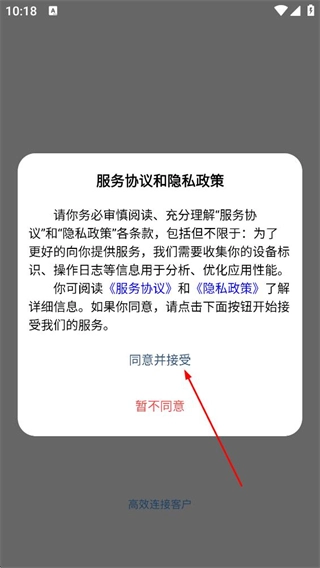 阅读服务协议与隐私政策后,点击“同意并接受”按钮,即可进入欢迎登录页面。