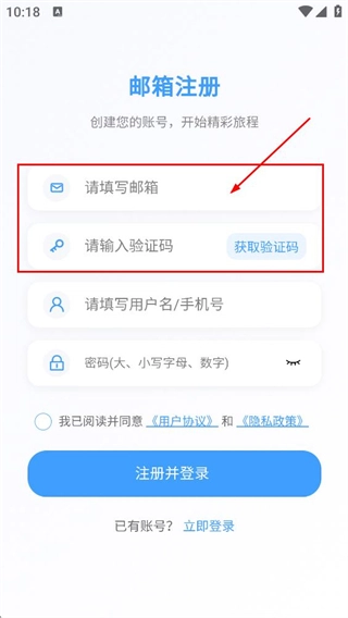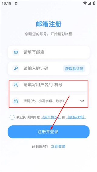 4、进入邮箱注册页面后,填写用户名或手机号以及密码,随后点击注册并登录按钮,以此完成注册流程。