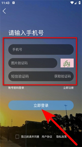 输入手机号码、图片验证码和短信验证码,勾选相关协议后,点击“立即登录”按钮,即可完成登录操作。