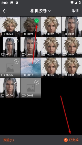 3、进入照片选择页面后,先点击【需处理视频】选项,再点击【已完成】按钮,即可进入编辑界面进行后续操作。