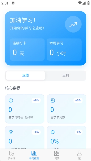 3、在学习统计页面中可以连续打卡,还可以了解本周学习,同时了解核心数据;