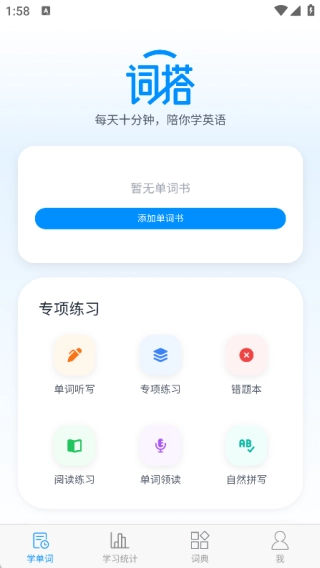 1、在学单词页面中可以添加单词书,还可以了解各种专项练习;