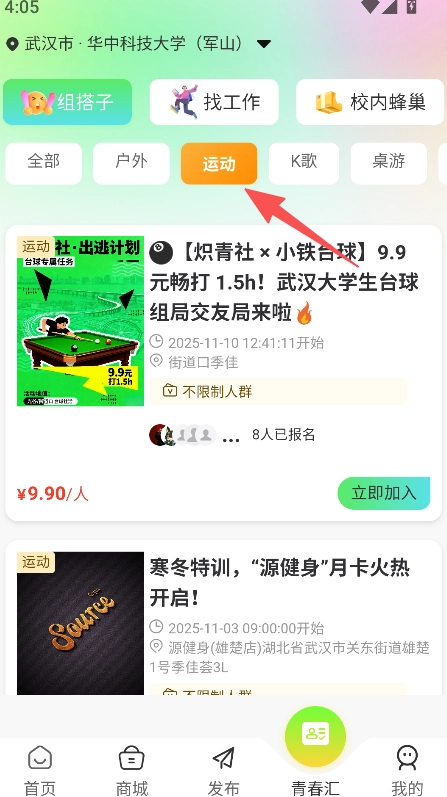 1、开设组搭子、找工作等板块,活动分类涵盖户外运动等类别,以匹配大学生参与校园活动及社交的需求。