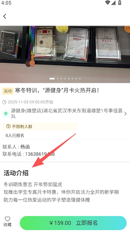 2、呈现活动的详细内容,可查看活动的时间、地点、活动介绍等信息,从而知晓活动的具体情况以及参与该活动的相关要求。