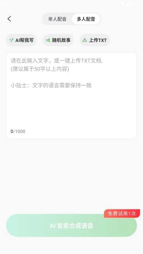 AI文字转语音具备多语言同步翻译朗读功能,还包含“AI帮我写”“随机故事”以及“上传TXT文件”这三种创意模式。