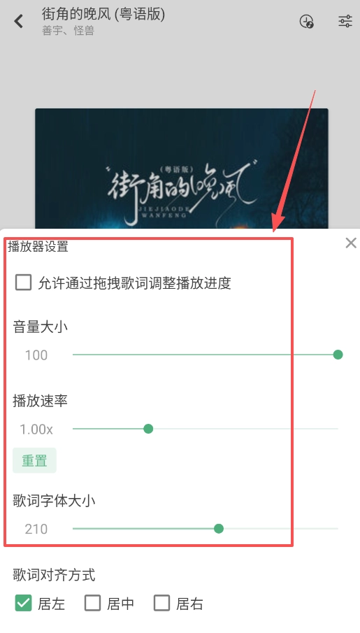 播放歌曲时,在此处可以开启歌词拖拽调整进度、调节音量和播放速度,还能放大歌词字体或更改对齐方式。