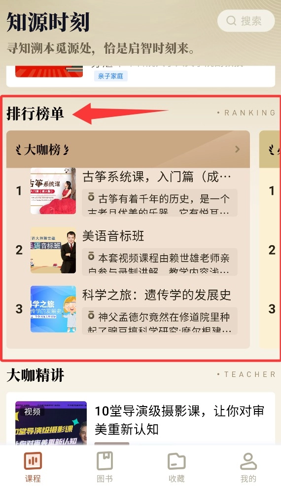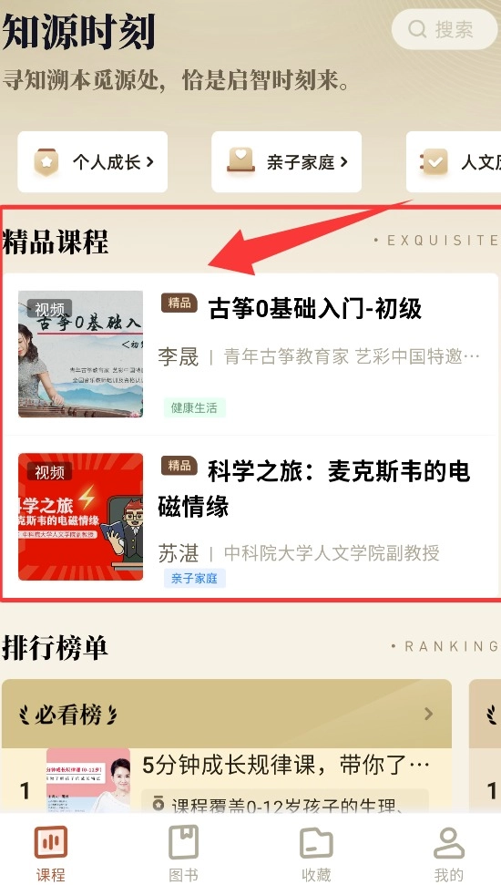打开知源时刻应用后,您可以借助搜索功能,快速找到特定的课程、知识专题或者相关的学习资料。