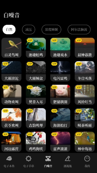 点击页面下方的“白噪音”选项,就能浏览到各种各样的白噪音资源。
