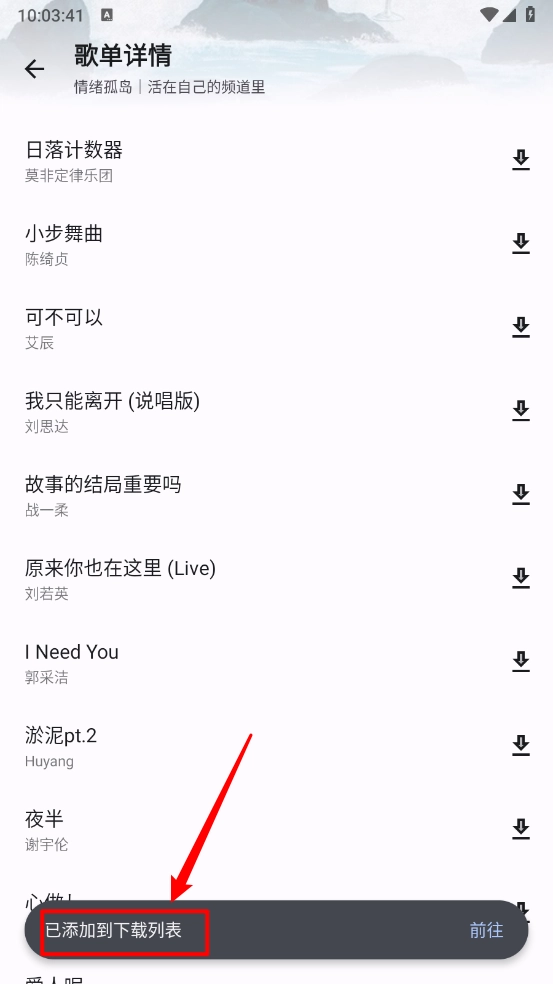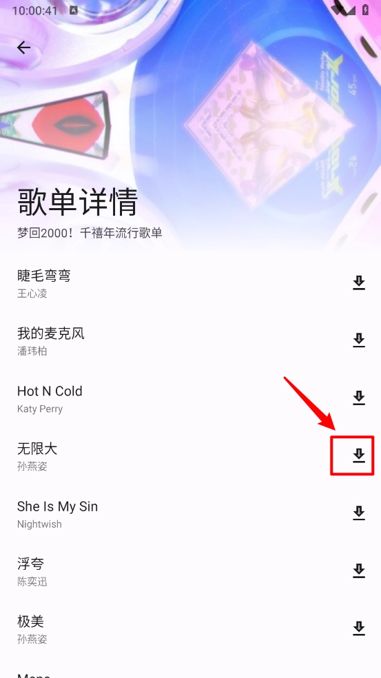 进入歌单详情页面,这里包含了多首歌曲,你可以选择并点击右侧的""图标。